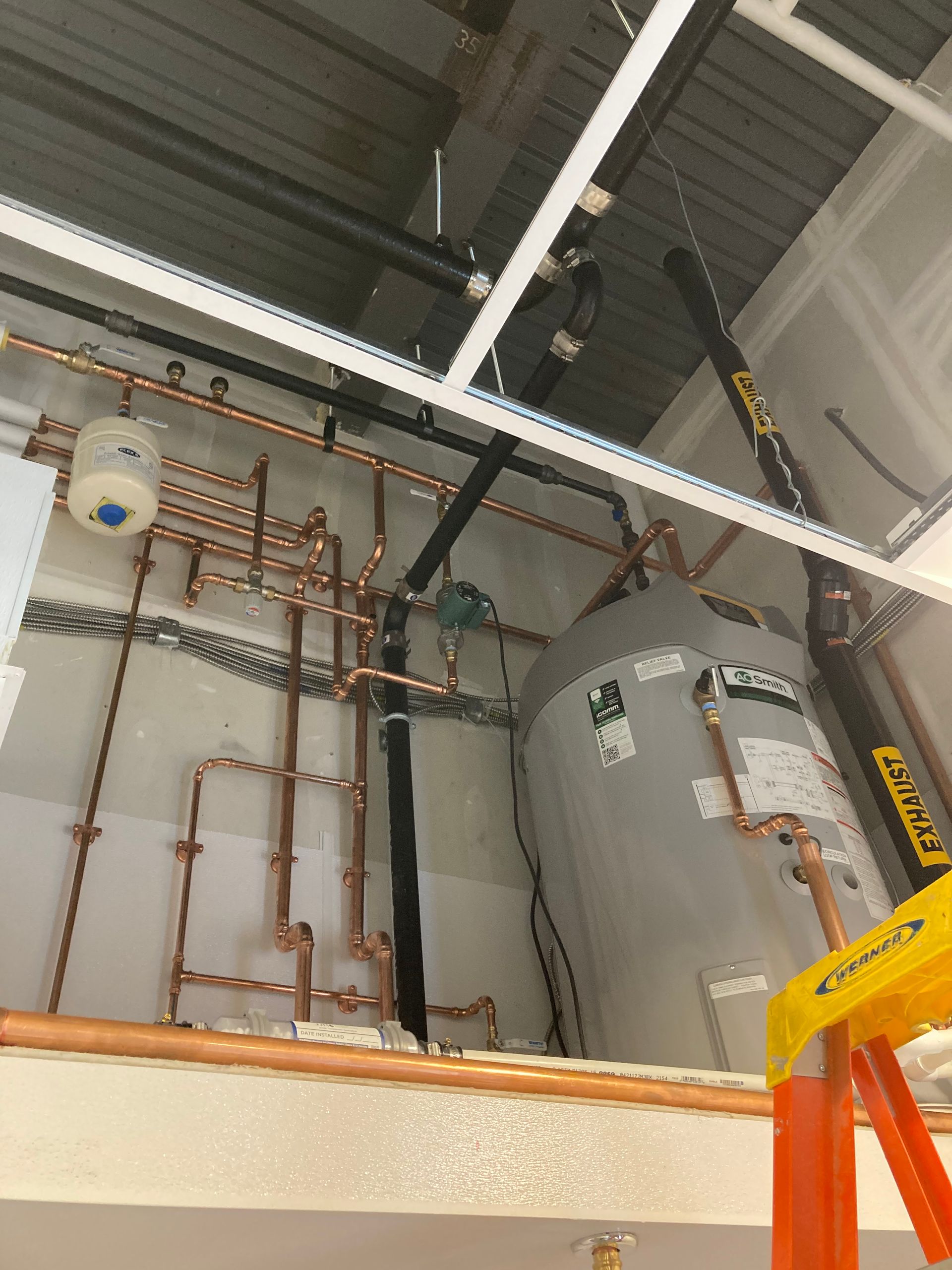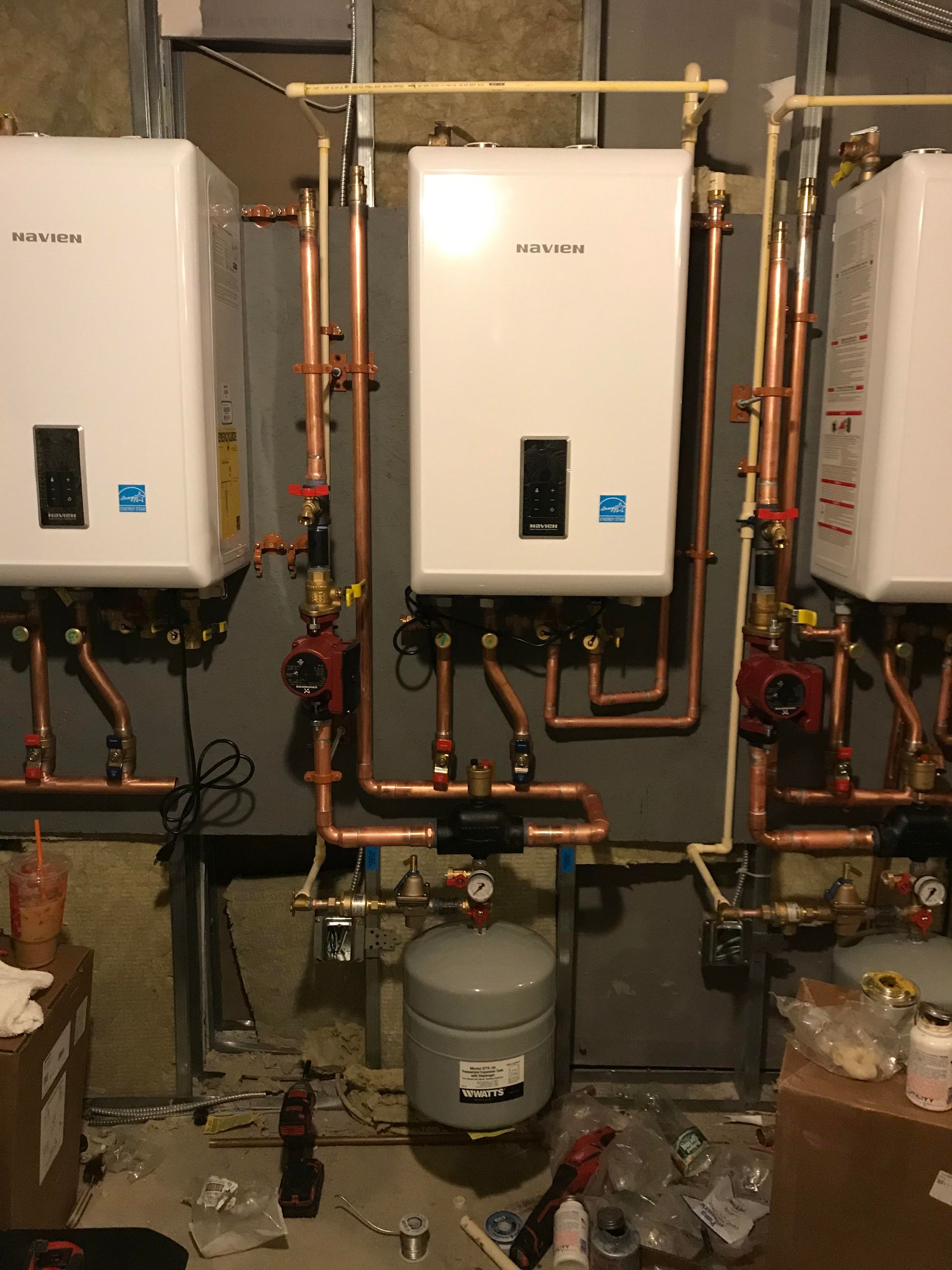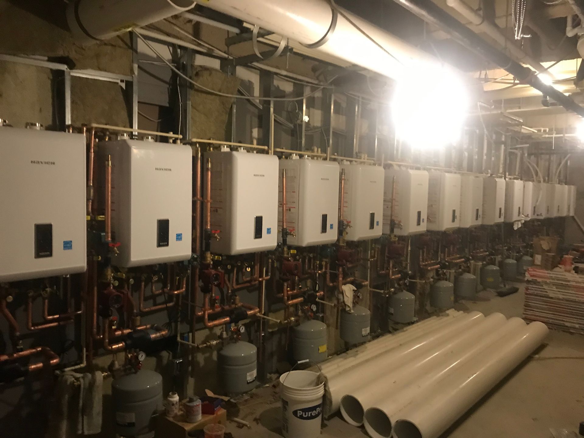 Converting plumbing systems from traditional water heating to tankless water heating systems for energy savings and continuous hot water supply.